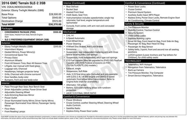2016 GMC Terrain SLE-2 Ebony Twilight Metallic 2.4L 4-Cylinder SIDI DOHC VVT 6-Speed Automatic FWD 4D Sport Utility17 x 7 Aluminum Wheels, 3.23 Axle Ratio, 4-Wheel Disc Brakes, 8 Speakers, 8-Way Power Driver Seat Adjuster, ABS brakes, Air Conditioning, Alloy wheels, AM/FM radio: SiriusXM, Auto-dimming Rear-View mirror, Automatic temperature control, Brake assist, Bumpers: body-color, Compass, Convenience Package, Delay-off headlights, Driver door bin, Driver vanity mirror, Dual front impact airbags, Dual front side impact airbags, E10 Fuel Capable, Electronic Stability Control, Emergency communication system, Exterior Parking Camera Rear, Four wheel independent suspension, Front anti-roll bar, Front Bucket Seats, Front Center Armrest, Front reading lights, Fully automatic headlights, Heated door mirrors, Heated Driver & Front Passenger Seats, Illuminated entry, Intellilink w/Bluetooth®, Low tire pressure warning, Occupant sensing airbag, Outside temperature display, Overhead airbag, Panic alarm, Passenger door bin, Passenger vanity mirror, Pioneer Premium 8-Speaker System, Power door mirrors, Power driver seat, Power steering, Power windows, Preferred Equipment Group 3SB, Premium Cloth Seat Trim, Radio data system, Radio: Color Touch AM/FM Stereo, Rear anti-roll bar, Rear seat center armrest, Rear window defroster, Rear window wiper, Remote keyless entry, Remote Vehicle Start, Roof rack: rails only, Security system, Single-Zone Automatic Climate Control, SiriusXM Satellite Radio, Speed control, Speed-sensing steering, Split folding rear seat, Spoiler, Steering wheel mounted audio controls, Tachometer, Telescoping steering wheel, Tilt steering wheel, Traction control, Trip computer, Variably intermittent wipers. 22/32 City/Highway MPG