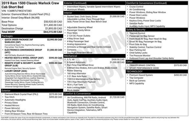 Clean CARFAX. 2019 Ram 1500 Classic Warlock Diamond Black Crystal Pearlcoat HEMI 5.7L V8 Multi Displacement VVT 8-Speed Automatic 4WD 4D Crew CabOdometer is 10416 miles below market average! 1-Yr SiriusXM Guardian Trial, 3.21 Rear Axle Ratio, 4-Wheel Disc Brakes, 40/20/40 Split Bench Seat, 4x4 Decal, 4x4 Flat Black Badge, 6 Speakers, 8.4 Touchscreen Display, 9 Alpine Speakers w/Subwoofer, ABS brakes, Active Grille Shutters, Air Conditioning, Air Conditioning ATC w/Dual Zone Control, Alloy wheels, AM/FM radio: SiriusXM, Apple CarPlay, Auto-Dimming Exterior Mirrors, Auto-Dimming Rear-View Mirror, Bi-Function Halogen Projector Headlamps, Black Exterior Mirrors, Black Exterior Truck Badging, Black Grille w/RAM Lettering, Black Headlamp Bezels, Black Headlamp Filler Panel, Black Powder Coated Front Bumper, Black Powder Coated Rear Bumper, Black RAM Head Tailgate Badge, Black Wheel Flares, Brake assist, Bumpers: chrome, Center Hub, Class IV Receiver Hitch, Cluster 7.0 TFT Color Display, Compass, Delay-off headlights, Driver door bin, Dual front impact airbags, Dual front side impact airbags, Dual Rear Exhaust w/Bright Tips, Electronic Shift, Electronic Stability Control, Electronics Group, Exterior Mirrors Courtesy Lamps, Exterior Mirrors w/Heating Element, Exterior Mirrors w/Supplemental Signals, Front anti-roll bar, Front Armrest w/3 Cupholders, Front Center Armrest w/Storage, Front LED Fog Lamps, Front reading lights, Front wheel independent suspension, Front Wheel Well Liners, Fully automatic headlights, Glove Box Lamp, Google Android Auto, GPS Antenna Input, HD Radio, Heated door mirrors, Heated Front Seats, Heated Seats & Wheel Group, Heated Steering Wheel, Hood Decal, Humidity Sensor, Illuminated entry, Integrated Voice Command w/Bluetooth®, Leather Wrapped Steering Wheel, LED Bed Lighting, Low tire pressure warning, Luxury Group, Media Hub (2 USB, AUX), Occupant sensing airbag, Outside temperature display, Overhead airbag, Overhead console, Overhead Console w/Garage Door Opener, Panic alarm, ParkSense Rear Park Assist System, ParkView Rear Back-Up Camera, Passenger door bin, Passenger vanity mirror, Power door mirrors, Power Heated Fold-Away Mirrors, Power steering, Power windows, Power-Folding Mirrors, Quick Order Package 26F Warlock, Radio data system, Radio: Uconnect 4C w/8.4 Display, Rear anti-roll bar, Rear Dome w/On/Off Switch Lamp, Rear Extra HD Shock Absorbers, Rear Floor Mats, Rear seat center armrest, Rear step bumper, Remote keyless entry, Remote Start & Security Alarm Group, Remote USB Port - Charge Only, Security Alarm, Semi-Gloss Black Hub, SiriusXM Satellite Radio, Speed control, Sport Performance Hood, Sport Tail Lamps, Steering Wheel Mounted Audio Controls, Storage Tray, Sun Visors w/Illuminated Vanity Mirrors, Tachometer, Tilt steering wheel, Tip Start, Tow Hooks, Traction control, Trailer Brake Control, Trip computer, Universal Garage Door Opener, USB Host Flip, Variably intermittent wipers, Voltmeter, Wheels: 20 x 8 Semi-Gloss Black Aluminum.