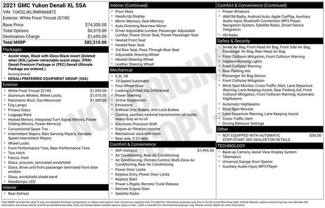 Clean CARFAX. 2021 GMC Yukon XL Denali White Frost Tricoat EcoTec3 6.2L V8 10-Speed Automatic with Overdrive 4WD 4D Sport UtilityOdometer is 26473 miles below market average! 4WD, 12-Way Power Seat Adjusters, 14 Speakers, 15 Diagonal Multi-Color Head-Up Display, 2 Presets For Outside Rearview Mirrors, 3.23 Rear Axle Ratio, 3rd Row 60/40 Power-Folding Split-Bench Seat, 3rd row seats: split-bench, 4-Wheel Disc Brakes, ABS brakes, Adaptive suspension, Air Conditioning, Alloy wheels, AM/FM radio: SiriusXM with 360L, Apple CarPlay/Android Auto, Auto High-beam Headlights, Auto-dimming door mirrors, Auto-dimming Rear-View mirror, Auto-leveling suspension, Automatic Emergency Braking, Automatic temperature control, Bodyside moldings, Bose 14-Speaker Surround w/CenterPoint, Brake assist, Bright Front & Rear Door Sill Plates, Bumpers: body-color, Chrome Door Handles w/Body-Color Strip, Compass, Delay-off headlights, Driver door bin, Driver vanity mirror, Dual Exhaust System, Dual front impact airbags, Dual front side impact airbags, Dual-Pane Panoramic Power Sunroof, Electronic Stability Control, Emergency communication system: OnStar and GMC connected services capable, Following Distance Indicator, Forward Collision Alert, Four wheel independent suspension, Front & Rear Park Assist, Front anti-roll bar, Front Bucket Seats, Front Center Armrest, Front dual zone A/C, Front fog lights, Front Pedestrian Braking, Front reading lights, Fully automatic headlights, Galvano Bodyside Moldings, Garage door transmitter, Hands-Free Power Programmable Rear Liftgate, HD Radio, HD Surround Vision, Heads-Up Display, Heated & Ventilated Driver & Front Passenger Seats, Heated 2nd Row Outboard Position Seats, Heated Automatic Steering Wheel, Heated door mirrors, Heated Driver & Front Passenger Seats, Heated front seats, Heated rear seats, Heated steering wheel, Hill Descent Control, Illuminated entry, Inside Rear-View Auto-Dimming Mirror, IntelliBeam Automatic High Beam On/Off, Lane Change Alert w/Side Blind Zone Alert, Lane Keep Assist w/Lane Departure Warning, Leather steering wheel, Low tire pressure warning, Magnetic Ride Control Suspension, Memory seat, Navigation System, Not Equipped w/Automatic Stop/Start, Occupant sensing airbag, Outside Heated Power-Adjustable Mirrors, Outside temperature display, Overhead airbag, Overhead console, Panic alarm, Passenger door bin, Passenger vanity mirror, Perforated Leather Seating Surfaces, Power door mirrors, Power driver seat, Power Liftgate, Power passenger seat, Power Release 2nd Row Bucket Seats, Power steering, Power Tilt & Telescopic Steering Column, Power windows, Preferred Equipment Group 5SA, Radio: AM/FM/SiriusXM w/Navigation, Rain sensing wipers, Rear air conditioning, Rear anti-roll bar, Rear Cross Traffic Alert, Rear Pedestrian Alert, Rear reading lights, Rear Seat Media System, Rear window defroster, Rear window wiper, Remote keyless entry, Roof rack: rails only, Safety Alert Seat, Security system, SiriusXM w/360L, Speed control, Speed-sensing steering, Split folding rear seat, Spoiler, Steering wheel memory, Steering wheel mounted audio controls, Tachometer, Telescoping steering wheel, Tilt steering wheel, Traction control, Trip computer, Turn signal indicator mirrors, Universal Home Remote, Variably intermittent wipers, Ventilated front seats, Voltmeter, Wheel Locks, Wheels: 20 x 9 6-Spoke Polished Aluminum, Wheels: 22 x 9 Bright Machined Aluminum, 4WD.