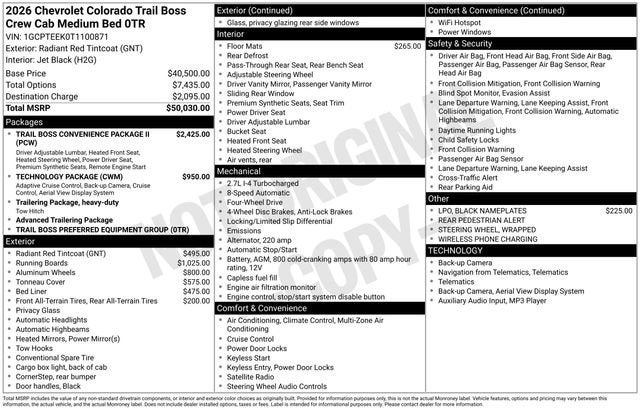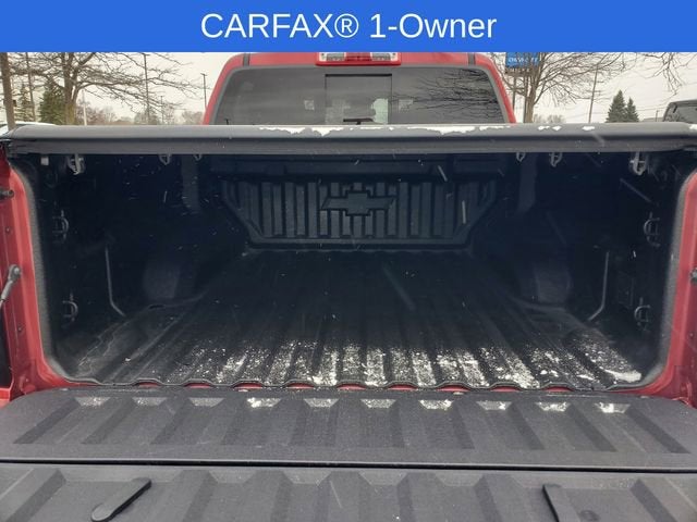4WD, 1st and 2nd Row All-Weather Floor Liner, 3.42 Rear Axle Ratio, 4-Spoke Wrapped Steering Wheel, 4-Way Manual Passenger Seat Adjuster, 4-Wheel Disc Brakes, 6 Speakers, 6-Speaker Audio System Feature, 6-Way Manual Driver Seat Adjuster, 8-Way Power Driver Seat Adjuster, ABS brakes, Adaptive Cruise Control, Air Conditioning, Alloy wheels, AM/FM radio: SiriusXM with 360L, Apple CarPlay/Android Auto, Auto High-beam Headlights, Automatic Emergency Braking, Automatic temperature control, Black Nameplates, Black Spray-on Bedliner with Chevrolet Logo, Brake assist, Chevy Safety Assist, Cloth Seat Trim, Compass, Delay-off headlights, Driver and Front Passenger Heated Seats, Driver door bin, Driver vanity mirror, Dual front impact airbags, Dual front side impact airbags, Electronic Stability Control, Emergency communication system: OnStar, Evotex Seat Trim, Following Distance Indicator, Forward Collision Alert, Front anti-roll bar, Front Bucket Seats, Front Center Armrest, Front dual zone A/C, Front Pedestrian and Bicyclist Braking, Front wheel independent suspension, HD Surround Vision, Heated door mirrors, Heated Steering Wheel, Illuminated entry, IntelliBeam Automatic High Beam on/Off, Lane Keep Assist with Lane Departure Warning, Low tire pressure warning, Navigation System, Occupant sensing airbag, Off-Road Assist Steps, Outside temperature display, Overhead airbag, Overhead console, Panic alarm, Passenger door bin, Passenger vanity mirror, Power door mirrors, Power Driver Lumbar Control Seat Adjuster, Power steering, Power windows, Preferred Equipment Group 0TR, Premier Soft Roll-Up Truck Bed Cover, Radio data system, Radio: 11.3 Diagonal Advanced Color LCD Display, Rear Pedestrian Alert, Rear reading lights, Rear step bumper, Rear window defroster, Remote keyless entry, Remote Vehicle Starter System, Security system, SiriusXM with 360L Trial Subscription, Speed control, Speed-sensing steering, Split folding rear seat, Steering Wheel Mounted Audio Controls, Steering wheel mounted audio controls, Tachometer, Technology Package, Tilt steering wheel, Traction control, Trail Boss Convenience Package II, Trip computer, Variably intermittent wipers, Wheels: 18 x 8.5 Black High Gloss Aluminum, Wheels: 20 x 9 High Gloss Black Aluminum, Wireless Phone Charging, Wireless Phone Projection, 4WD.
